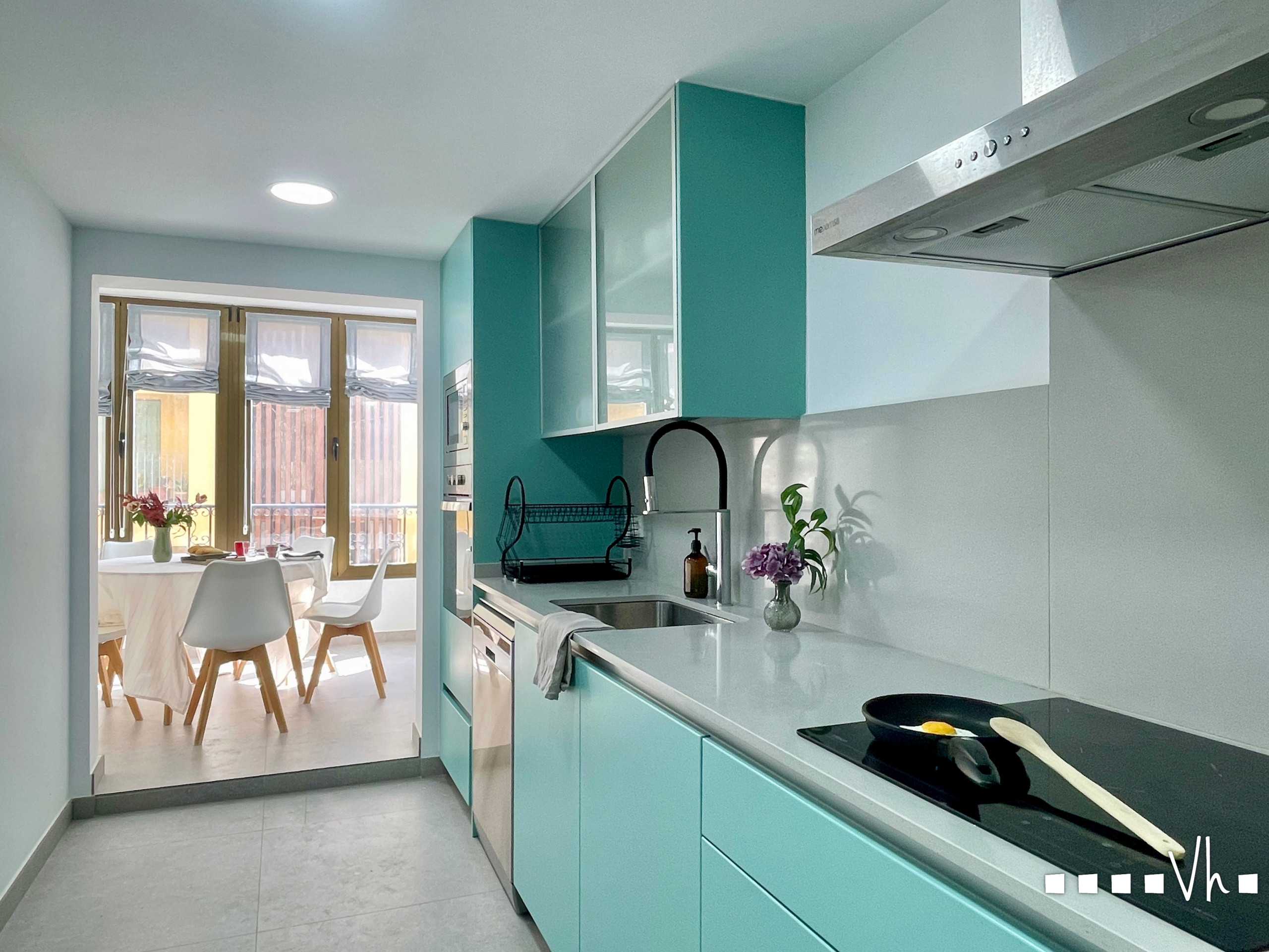 La cocina, moderna y funcional, está equipada con todo lo necesario para sus vacaciones. El apartamiento tiene dos dormitorios, uno con cama de matrimonio y otro con dos camas indiviaduales, y un baño con ducha. Todas las estancias tienen aire acondicionado.