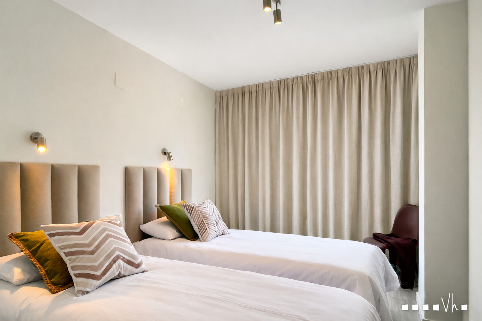 The main bedroom is a space designed for real rest: King Size bed with a headboard upholstered in beige ribbed fabric, hanging lamps and built-in wardrobes from floor to ceiling with integrated television. Its en-suite bathroom combines clean design and functionality with quality finishes. The second bedroom has two single beds and its own complete bathroom, ideal for children or friends seeking their own space.